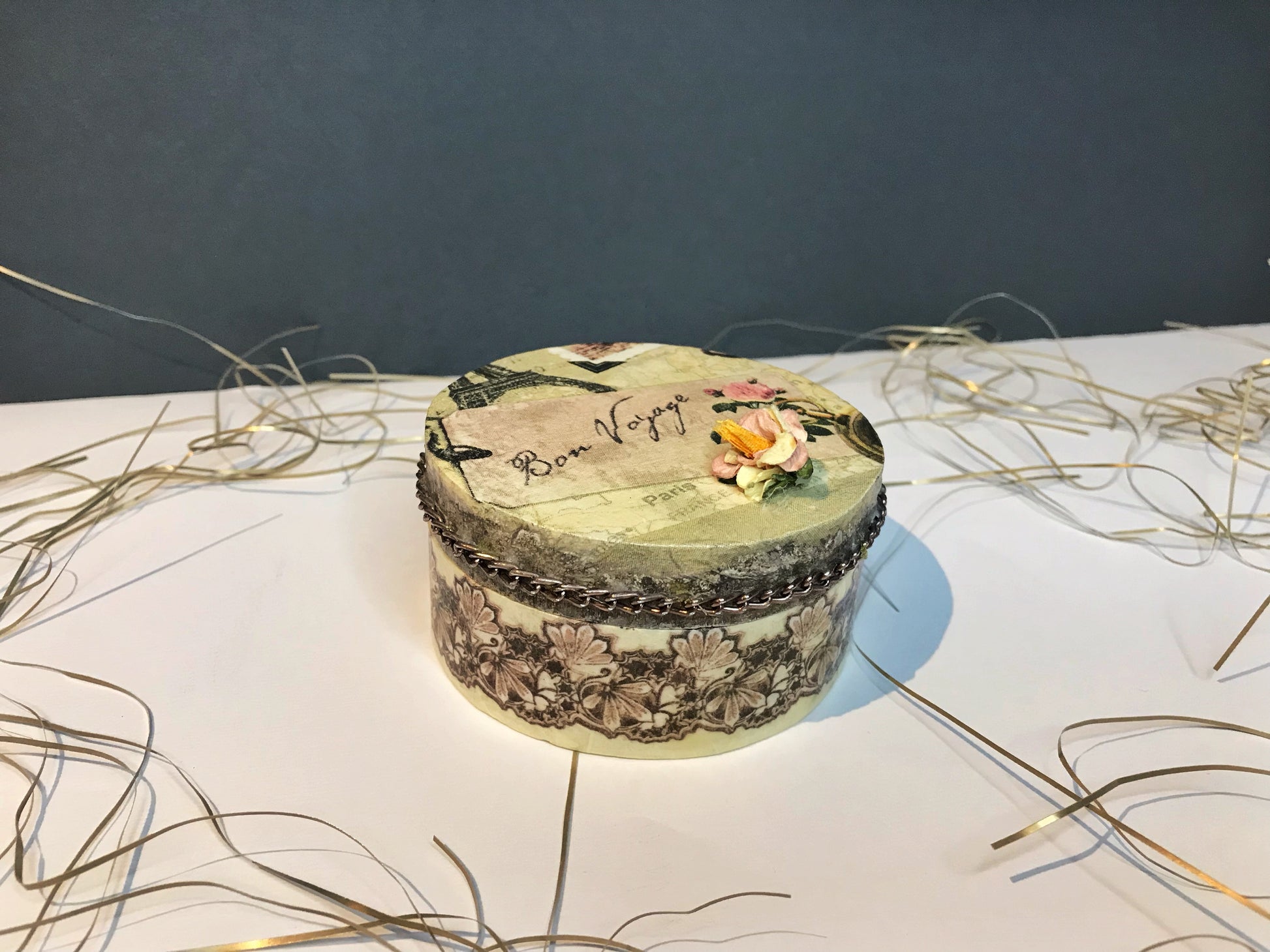 Drvena kutija kružnog oblika sa metalnim detaljima, ukrašena akrilnim bojama i lakovima na vodenoj bazi.